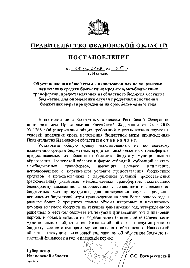 Постановление Правительства Ивановской области от 06.02.2019 N 45-п "Об установлении общей суммы использованных не по целевому назначению средств бюджетных кредитов, межбюджетных трансфертов, предоставляемых из областного бюджета местным бюджетам, для определения случая продления исполнения бюджетной меры принуждения на срок более одного года"