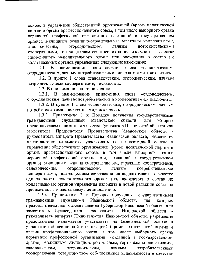 Постановление Правительства Ивановской области от 06.02.2019 N 43-п "О внесении изменений в постановление Правительства Ивановской области от 24.08.2017 N 333-п "Об утверждении Порядка получения государственными гражданскими служащими Ивановской области, для которых представителем нанимателя является Губернатор Ивановской области или заместитель Председателя Правительства Ивановской области - руководитель аппарата Правительства Ивановской области, разрешения представителя нанимателя участвовать на безвозмездной основе в управлении общественной организацией (кроме политической партии и органа профессионального союза, в том числе выборного органа первичной профсоюзной организации, созданной в государственном органе), жилищным, жилищно-строительным, гаражным кооперативами, садоводческим, огородническим, дачным потребительскими кооперативами, товариществом собственников недвижимости в качестве единоличного исполнительного органа или вхождения в состав их коллегиальных органов управления"