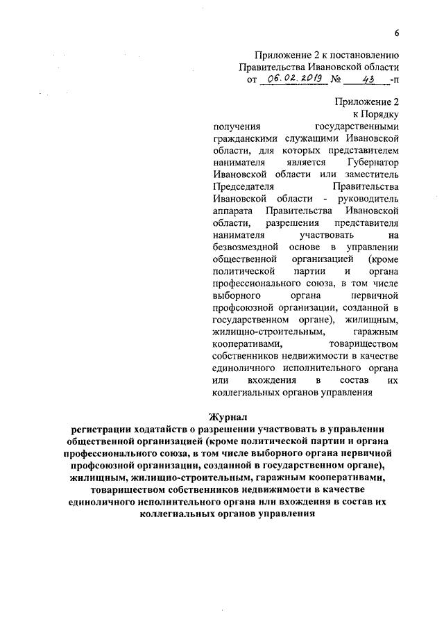 Постановление Правительства Ивановской области от 06.02.2019 N 43-п "О внесении изменений в постановление Правительства Ивановской области от 24.08.2017 N 333-п "Об утверждении Порядка получения государственными гражданскими служащими Ивановской области, для которых представителем нанимателя является Губернатор Ивановской области или заместитель Председателя Правительства Ивановской области - руководитель аппарата Правительства Ивановской области, разрешения представителя нанимателя участвовать на безвозмездной основе в управлении общественной организацией (кроме политической партии и органа профессионального союза, в том числе выборного органа первичной профсоюзной организации, созданной в государственном органе), жилищным, жилищно-строительным, гаражным кооперативами, садоводческим, огородническим, дачным потребительскими кооперативами, товариществом собственников недвижимости в качестве единоличного исполнительного органа или вхождения в состав их коллегиальных органов управления"
