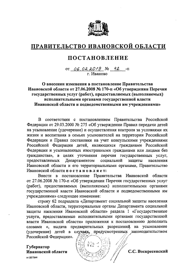 Постановление Правительства Ивановской области от 06.02.2019 N 42-п "О внесении изменения в постановление Правительства Ивановской области от 27.06.2008 N 170-п "Об утверждении Перечня государственных услуг (работ), предоставляемых (выполняемых) исполнительными органами государственной власти Ивановской области и подведомственными им учреждениями"