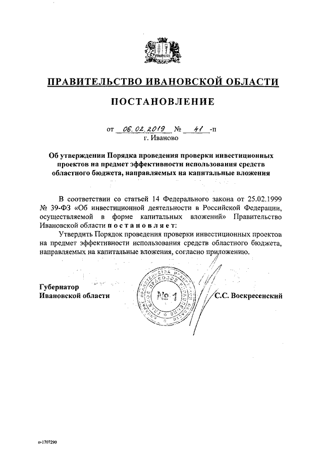 Постановление Правительства Ивановской области от 06.02.2019 N 41-п "Об утверждении Порядка проведения проверки инвестиционных проектов на предмет эффективности использования средств областного бюджета, направляемых на капитальные вложения"