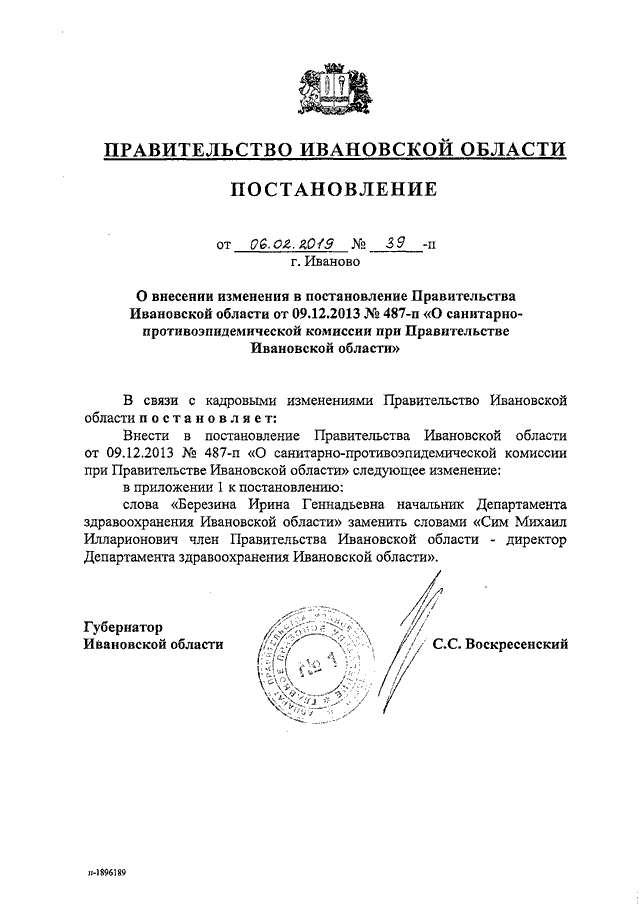 Постановление Правительства Ивановской области от 06.02.2019 N 39-п "О внесении изменения в постановление Правительства Ивановской области от 09.12.2013 N 487-п "О санитарно-противоэпидемической комиссии при Правительстве Ивановской области"
