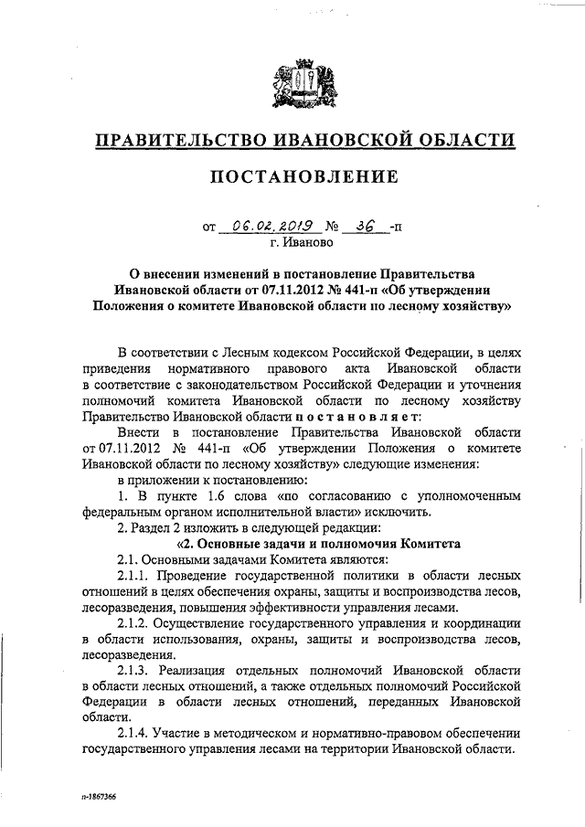 Постановление Правительства Ивановской области от 06.02.2019 N 36-п "О внесении изменений в постановление Правительства Ивановской области от 07.11.2012 N 441-п "Об утверждении Положения о комитете Ивановской области по лесному хозяйству"