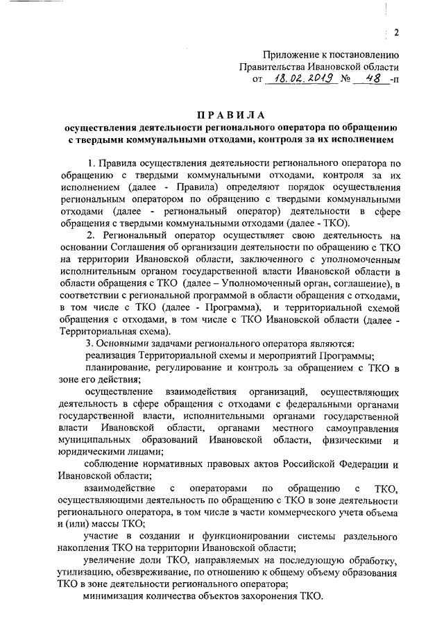 Постановление Правительства Ивановской области от 18.02.2019 N 48-п "Об утверждении Правил осуществления деятельности регионального оператора по обращению с твердыми коммунальными отходами на территории Ивановской области, контроля за их исполнением"