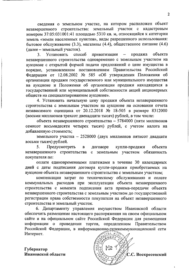 Распоряжение Правительства Ивановской области от 25.02.2019 N 19-рп "Об условиях приватизации объекта незавершенного строительства с земельным участком по адресу: Ивановская область, Ивановский район, д. Никульское, д. 32А, находящихся в собственности Ивановской области"