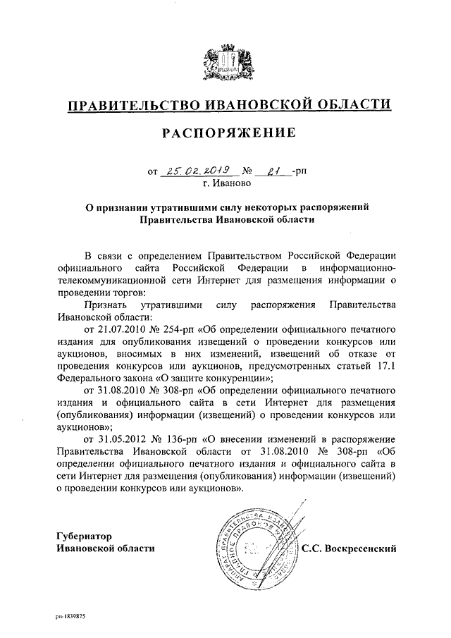 Распоряжение Правительства Ивановской области от 25.02.2019 N 21-рп "О признании утратившими силу некоторых распоряжений Правительства Ивановской области"
