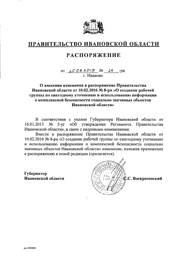 Распоряжение Правительства Ивановской области от 25.02.2019 N 24-рп "О внесении изменения в распоряжение Правительства Ивановской области от 10.02.2016 N 8-рп "О создании рабочей группы по ежегодному уточнению и использованию информации о комплексной безопасности социально значимых объектов Ивановской области"