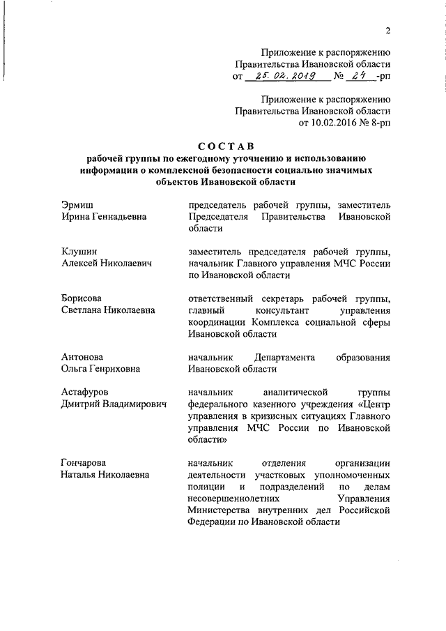 Распоряжение Правительства Ивановской области от 25.02.2019 N 24-рп "О внесении изменения в распоряжение Правительства Ивановской области от 10.02.2016 N 8-рп "О создании рабочей группы по ежегодному уточнению и использованию информации о комплексной безопасности социально значимых объектов Ивановской области"