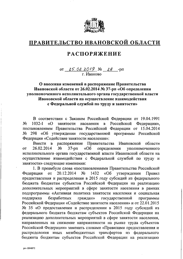 Распоряжение Правительства Ивановской области от 25.02.2019 N 26-рп "О внесении изменений в распоряжение Правительства Ивановской области от 26.02.2014 N 37-рп "Об определении уполномоченного исполнительного органа государственной власти Ивановской области на осуществление взаимодействия с Федеральной службой по труду и занятости"