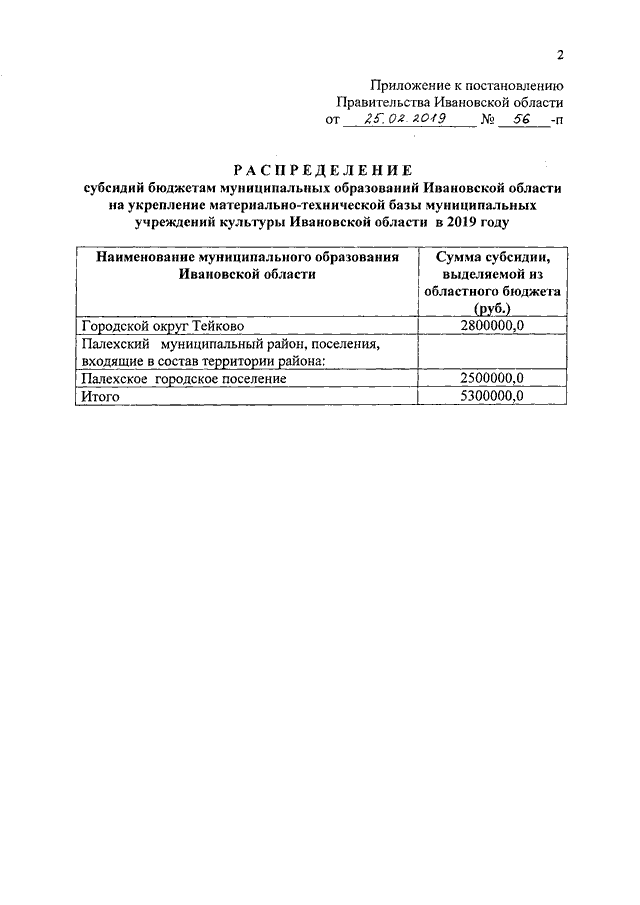 Постановление Правительства Ивановской области от 25.02.2019 N 56-п "О распределении субсидий бюджетам муниципальных образований Ивановской области на укрепление материально-технической базы муниципальных учреждений культуры Ивановской области в 2019 году"
