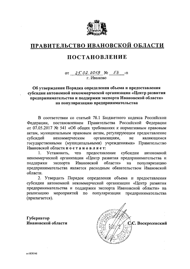 Постановление Правительства Ивановской области от 25.02.2019 N 53-п "Об утверждении Порядка определения объема и предоставления субсидии автономной некоммерческой организации "Центр развития предпринимательства и поддержки экспорта Ивановской области" на популяризацию предпринимательства"