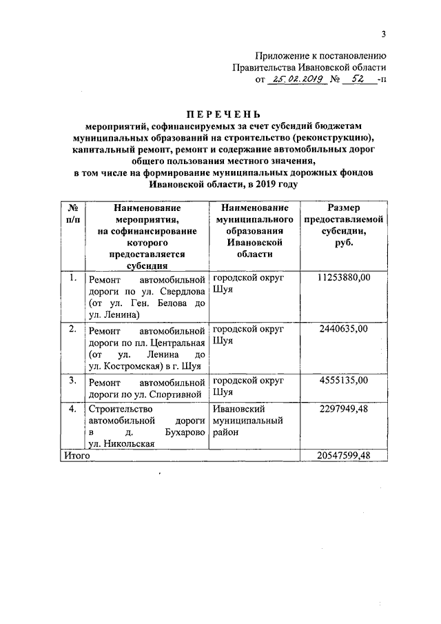 Постановление Правительства Ивановской области от 25.02.2019 N 52-п "Об утверждении перечня мероприятий, софинансируемых за счет субсидий бюджетам муниципальных образований на строительство (реконструкцию), капитальный ремонт, ремонт и содержание автомобильных дорог общего пользования местного значения, в том числе на формирование муниципальных дорожных фондов Ивановской области, в 2019 году"