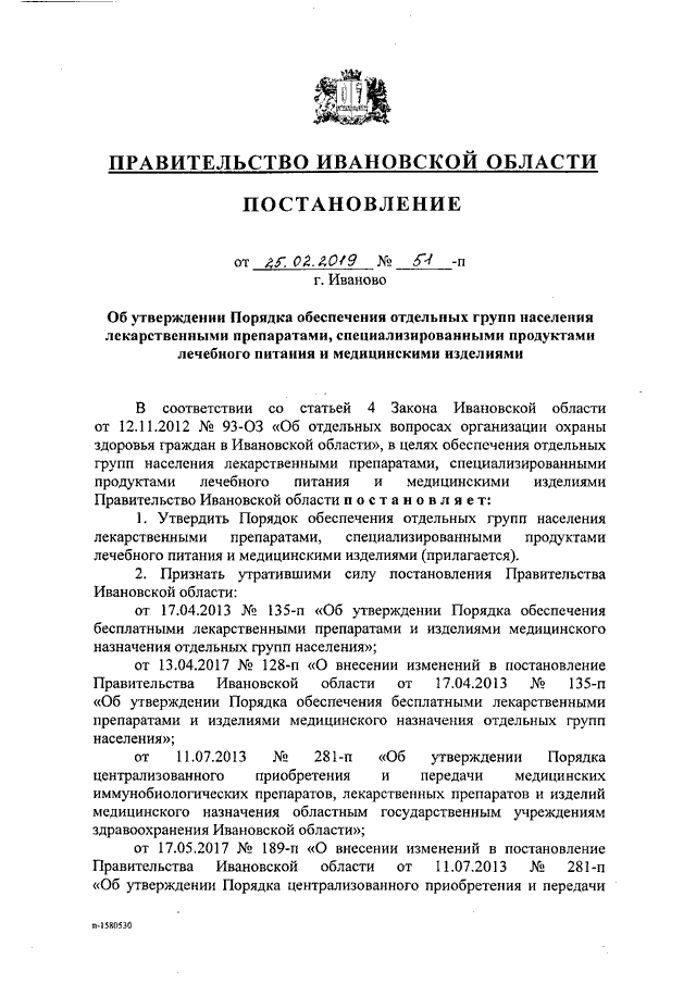 Постановление Правительства Ивановской области от 25.02.2019 N 51-п "Об утверждении Порядка обеспечения отдельных групп населения лекарственными препаратами, специализированными продуктами лечебного питания и медицинскими изделиями"