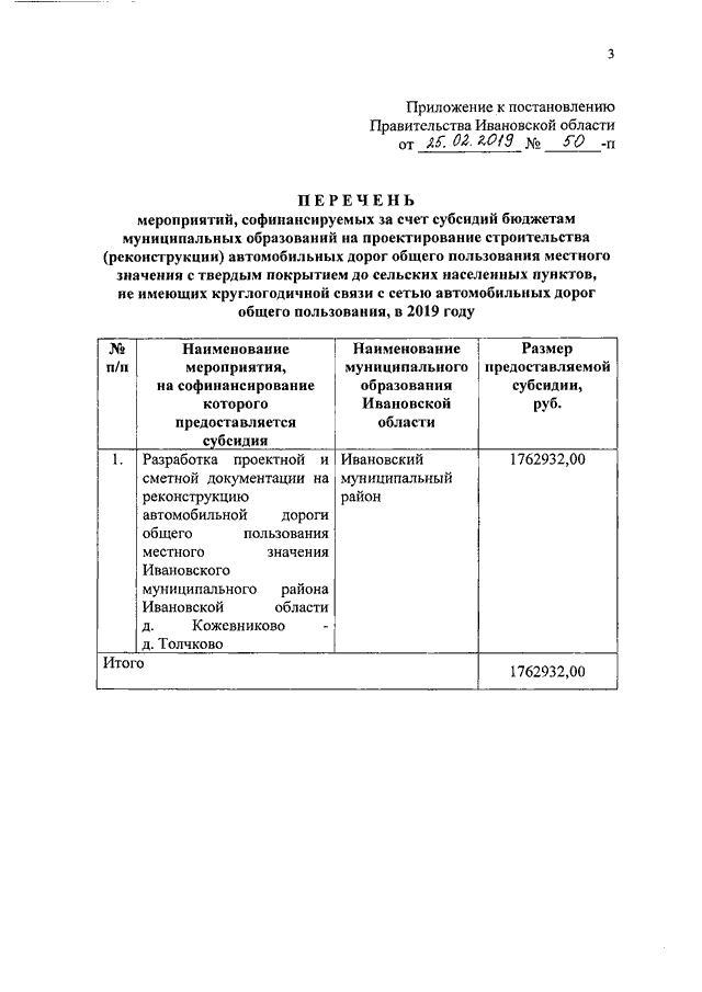 Постановление Правительства Ивановской области от 25.02.2019 N 50-п "Об утверждении перечня мероприятий, софинансируемых за счет субсидий бюджетам муниципальных образований на проектирование строительства (реконструкции) автомобильных дорог общего пользования местного значения с твердым покрытием до сельских населенных пунктов, не имеющих круглогодичной связи с сетью автомобильных дорог общего пользования, в 2019 году"