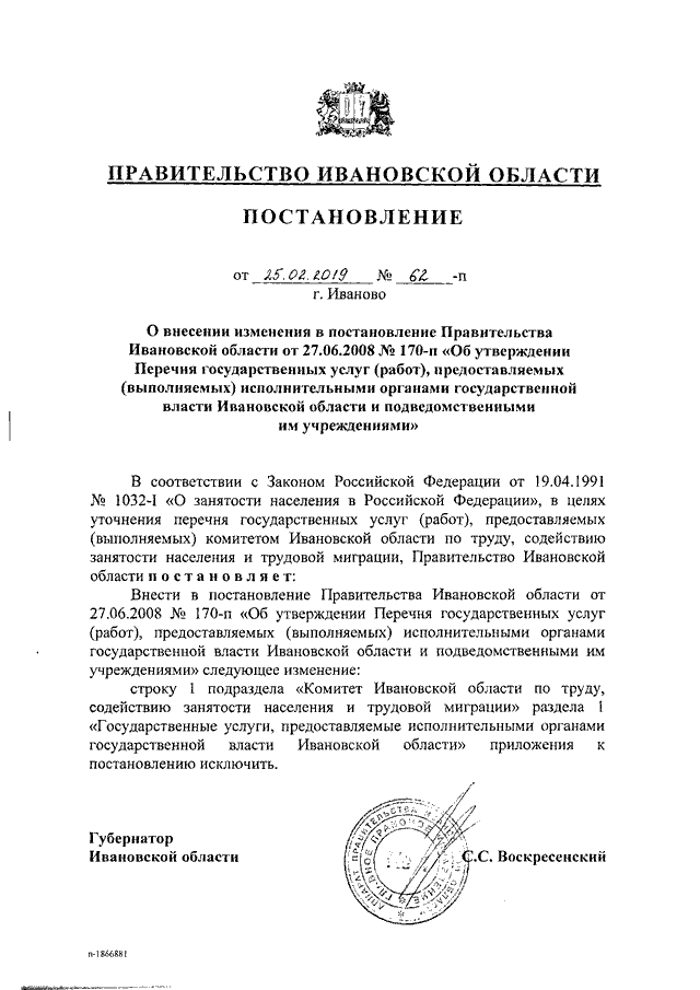 Постановление Правительства Ивановской области от 25.02.2019 N 62-п "О внесении изменения в постановление Правительства Ивановской области от 27.06.2008 N 170-п "Об утверждении Перечня государственных услуг (работ), предоставляемых (выполняемых) исполнительными органами государственной власти Ивановской области и подведомственными им учреждениями"