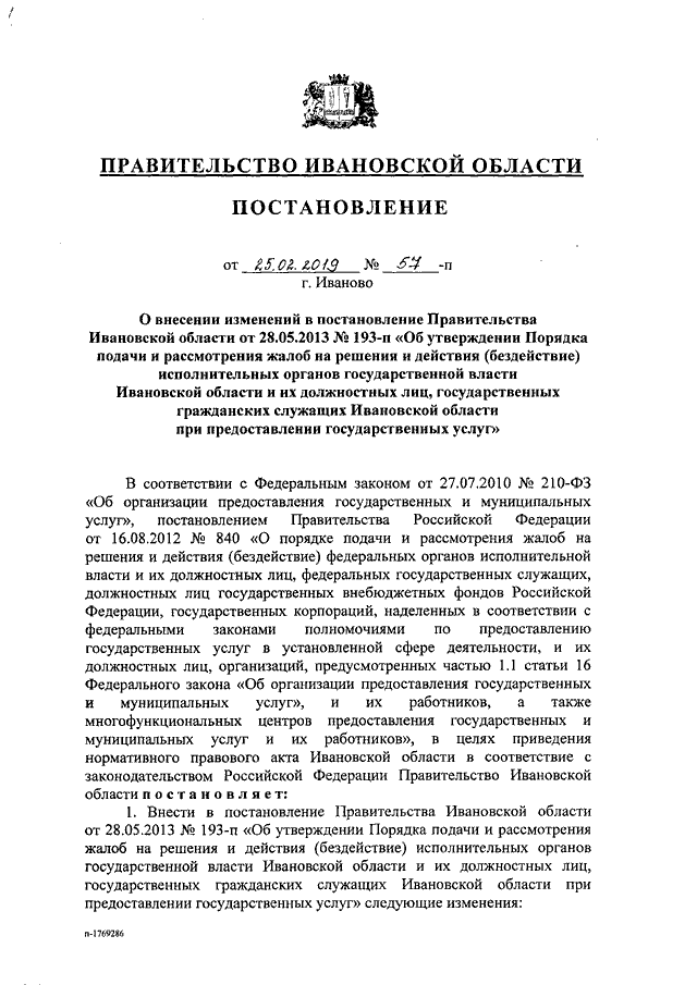Постановление Правительства Ивановской области от 25.02.2019 N 57-п "О внесении изменений в постановление Правительства Ивановской области от 28.05.2013 N 193-п "Об утверждении Порядка подачи и рассмотрения жалоб на решения и действия (бездействие) исполнительных органов государственной власти Ивановской области и их должностных лиц, государственных гражданских служащих Ивановской области при предоставлении государственных услуг" (вместе с "Порядком подачи и рассмотрения жалоб на решения и действия (бездействие) исполнительных органов государственной власти Ивановской области и их должностных лиц, государственных гражданских служащих исполнительных органов государственной власти Ивановской области, а также многофункциональных центров предоставления государственных и муниципальных услуг и их работников при предоставлении государственных услуг")