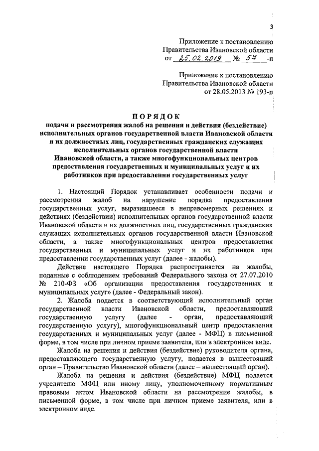 Постановление Правительства Ивановской области от 25.02.2019 N 57-п "О внесении изменений в постановление Правительства Ивановской области от 28.05.2013 N 193-п "Об утверждении Порядка подачи и рассмотрения жалоб на решения и действия (бездействие) исполнительных органов государственной власти Ивановской области и их должностных лиц, государственных гражданских служащих Ивановской области при предоставлении государственных услуг" (вместе с "Порядком подачи и рассмотрения жалоб на решения и действия (бездействие) исполнительных органов государственной власти Ивановской области и их должностных лиц, государственных гражданских служащих исполнительных органов государственной власти Ивановской области, а также многофункциональных центров предоставления государственных и муниципальных услуг и их работников при предоставлении государственных услуг")