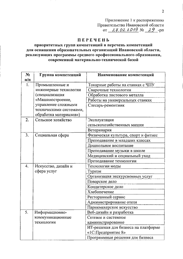 Распоряжение Правительства Ивановской области от 27.02.2019 N 29-рп "Об утверждении перечня приоритетных групп компетенций и перечня компетенций для оснащения образовательных организаций Ивановской области, реализующих программы среднего профессионального образования, современной материально-технической базой, перечня профессиональных образовательных организаций Ивановской области, реализующих программы среднего профессионального образования, для создания мастерских"