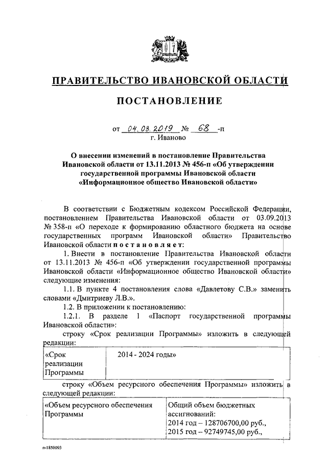 Постановление Правительства Ивановской области от 04.03.2019 N 68-п "О внесении изменений в постановление Правительства Ивановской области от 13.11.2013 N 456-п "Об утверждении государственной программы Ивановской области "Информационное общество Ивановской области"