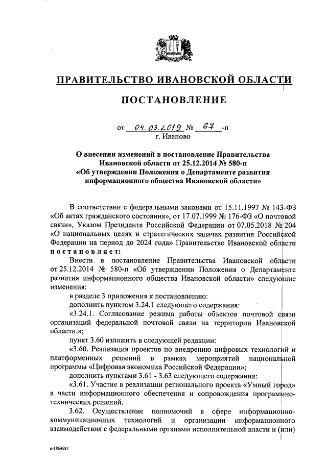 Постановление Правительства Ивановской области от 04.03.2019 N 67-п "О внесении изменений в постановление Правительства Ивановской области от 25.12.2014 N 580-п "Об утверждении Положения о Департаменте развития информационного общества Ивановской области"