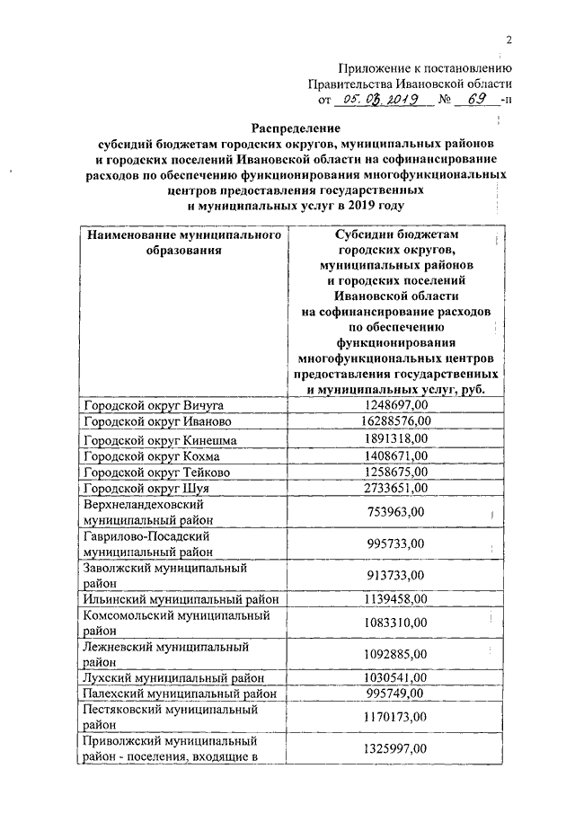 Постановление Правительства Ивановской области от 05.03.2019 N 69-п "О распределении в 2019 году субсидий бюджетам городских округов, муниципальных районов и городских поселений Ивановской области на софинансирование расходов по обеспечению функционирования многофункциональных центров предоставления государственных и муниципальных услуг"