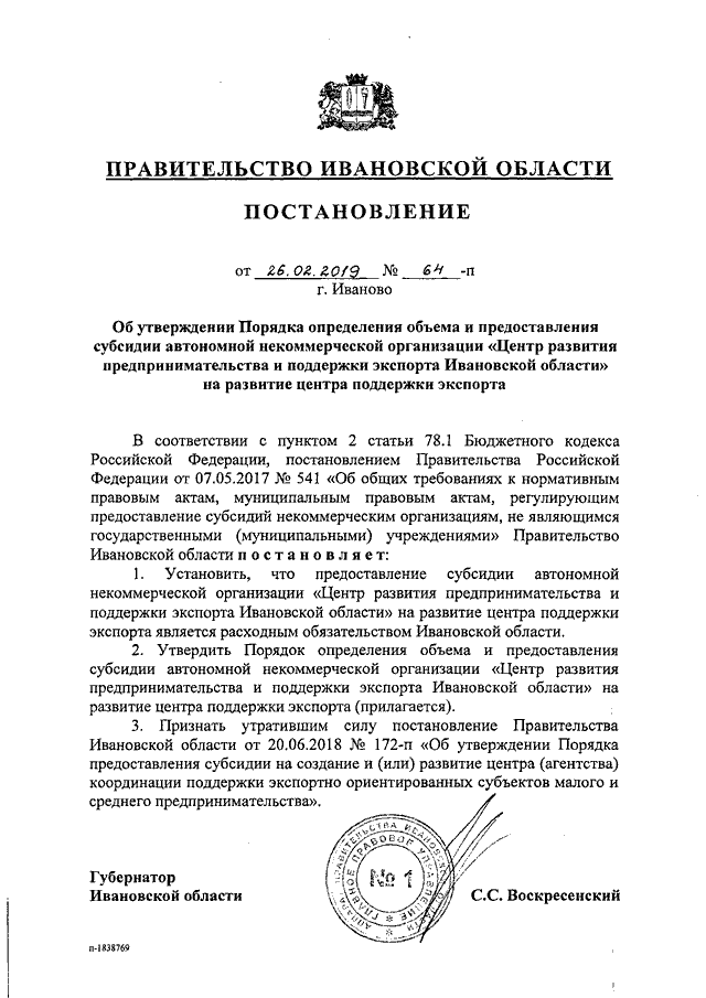 Постановление Правительства Ивановской области от 26.02.2019 N 64-п "Об утверждении Порядка определения объема и предоставления субсидии автономной некоммерческой организации "Центр развития предпринимательства и поддержки экспорта Ивановской области" на развитие центра поддержки экспорта"