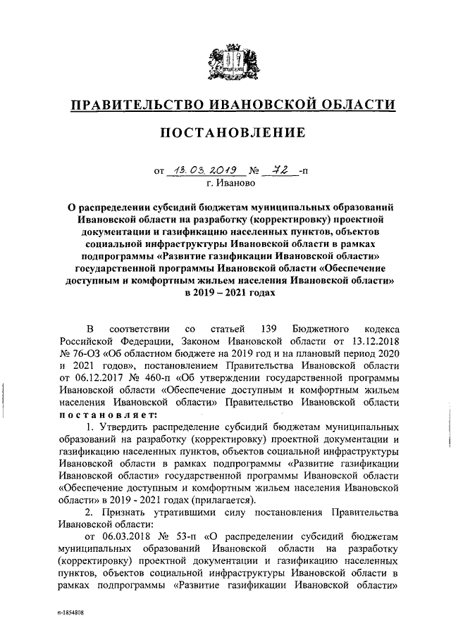 Постановление Правительства Ивановской области от 13.03.2019 N 72-п "О распределении субсидий бюджетам муниципальных образований Ивановской области на разработку (корректировку) проектной документации и газификацию населенных пунктов, объектов социальной инфраструктуры Ивановской области в рамках подпрограммы "Развитие газификации Ивановской области" государственной программы Ивановской области "Обеспечение доступным и комфортным жильем населения Ивановской области" в 2019 - 2021 годах"