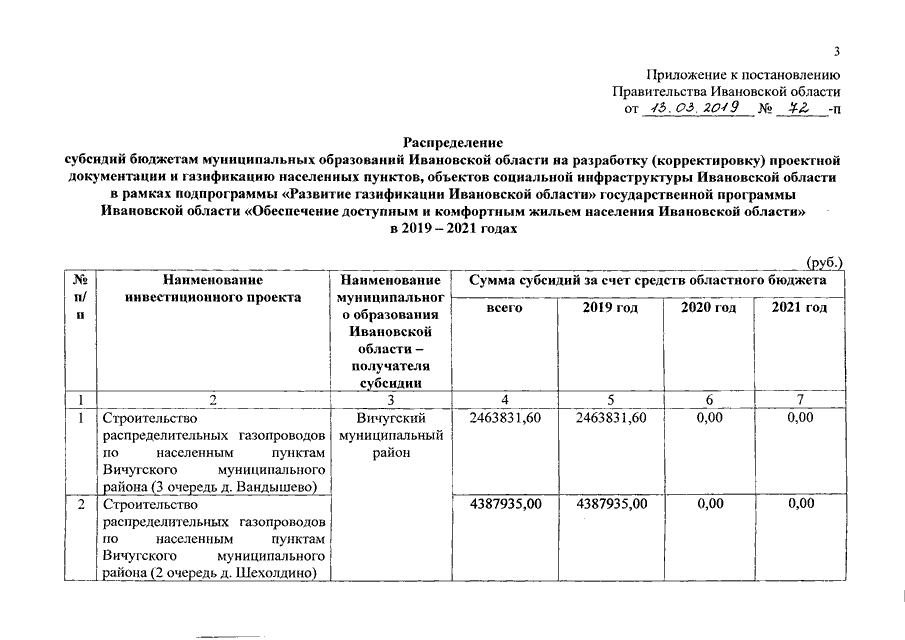 Постановление Правительства Ивановской области от 13.03.2019 N 72-п "О распределении субсидий бюджетам муниципальных образований Ивановской области на разработку (корректировку) проектной документации и газификацию населенных пунктов, объектов социальной инфраструктуры Ивановской области в рамках подпрограммы "Развитие газификации Ивановской области" государственной программы Ивановской области "Обеспечение доступным и комфортным жильем населения Ивановской области" в 2019 - 2021 годах"