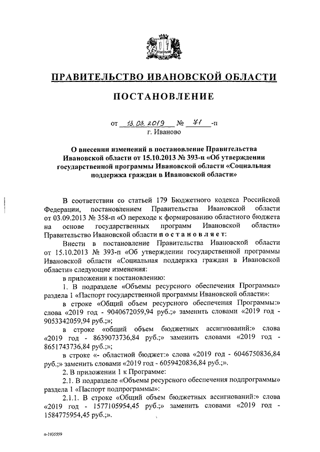 Постановление Правительства Ивановской области от 13.03.2019 N 71-п "О внесении изменений в постановление Правительства Ивановской области от 15.10.2013 N 393-п "Об утверждении государственной программы Ивановской области "Социальная поддержка граждан в Ивановской области"