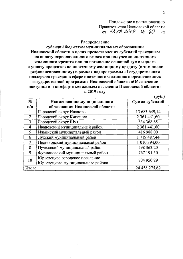 Постановление Правительства Ивановской области от 18.03.2019 N 80-п "О распределении субсидий бюджетам муниципальных образований Ивановской области в целях предоставления субсидий гражданам на оплату первоначального взноса при получении ипотечного жилищного кредита или на погашение основной суммы долга и уплату процентов по ипотечному жилищному кредиту (в том числе рефинансированному) в рамках подпрограммы "Государственная поддержка граждан в сфере ипотечного жилищного кредитования" государственной программы Ивановской области "Обеспечение доступным и комфортным жильем населения Ивановской области" в 2019 году"