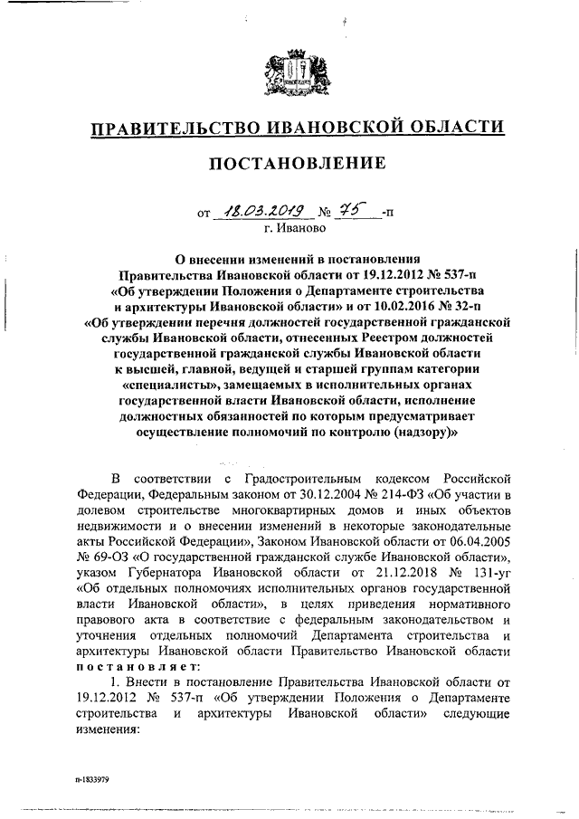 Постановление Правительства Ивановской области от 18.03.2019 N 75-п "О внесении изменений в постановления Правительства Ивановской области от 19.12.2012 N 537-п "Об утверждении Положения о Департаменте строительства и архитектуры Ивановской области" и от 10.02.2016 N 32-п "Об утверждении перечня должностей государственной гражданской службы Ивановской области, отнесенных Реестром должностей государственной гражданской службы Ивановской области к высшей, главной, ведущей и старшей группам категории "специалисты", замещаемых в исполнительных органах государственной власти Ивановской области, исполнение должностных обязанностей по которым предусматривает осуществление полномочий по контролю (надзору)"