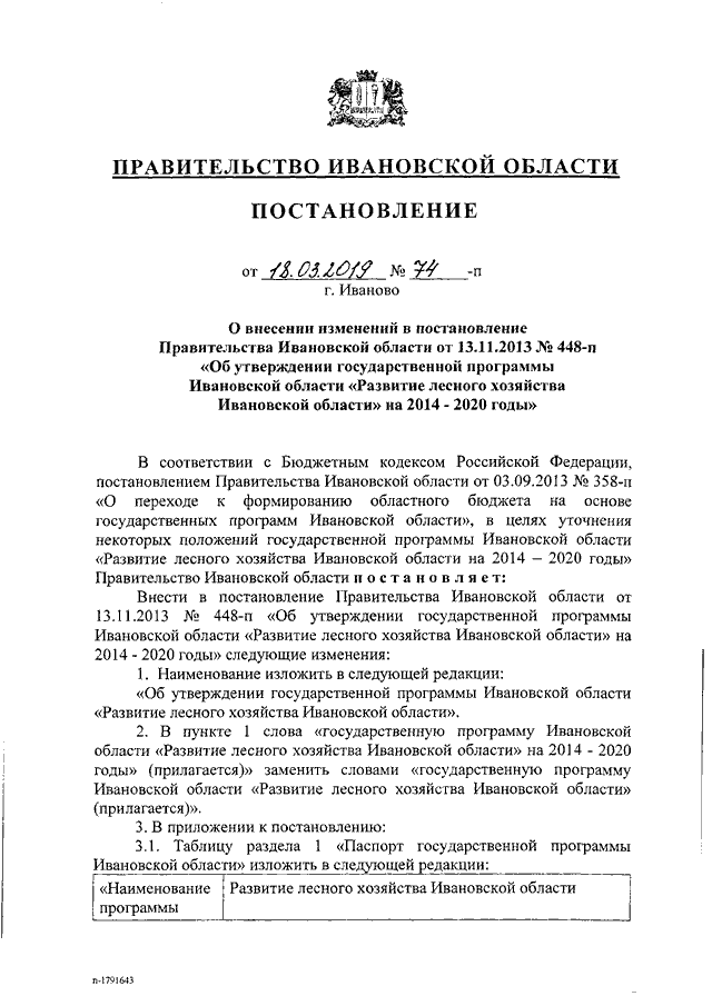 Постановление Правительства Ивановской области от 18.03.2019 N 74-п "О внесении изменений в постановление Правительства Ивановской области от 13.11.2013 N 448-п "Об утверждении государственной программы Ивановской области "Развитие лесного хозяйства Ивановской области" на 2014 - 2020 годы"