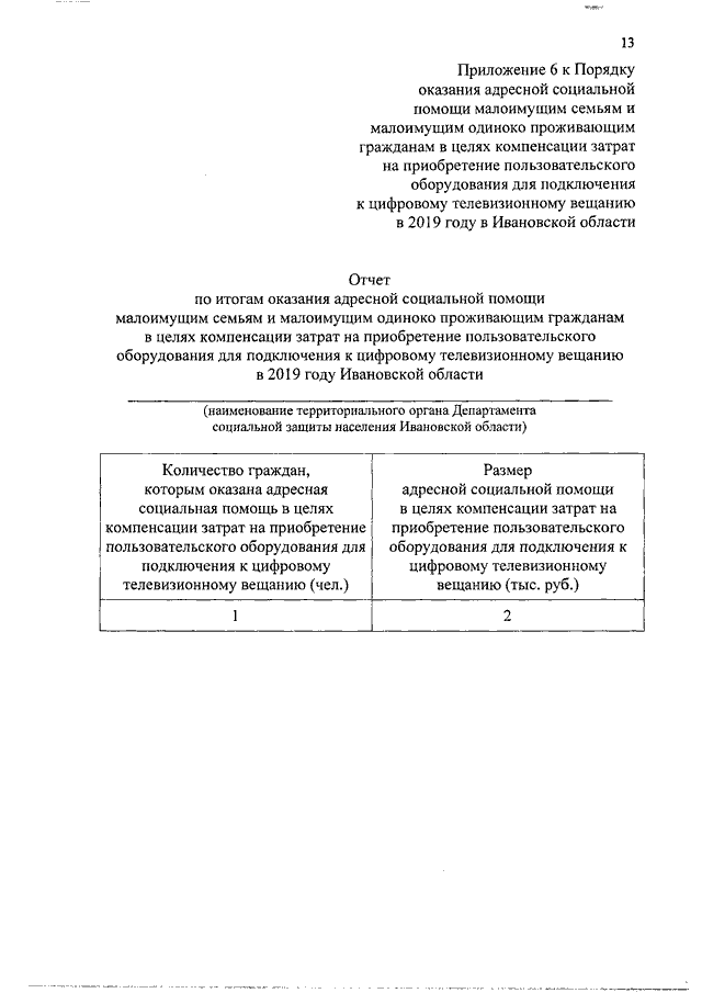 Постановление Правительства Ивановской области от 19.03.2019 N 104-п "Об утверждении Порядка оказания адресной социальной помощи малоимущим семьям и малоимущим одиноко проживающим гражданам в целях компенсации затрат на приобретение пользовательского оборудования для подключения к цифровому телевизионному вещанию в 2019 году в Ивановской области"