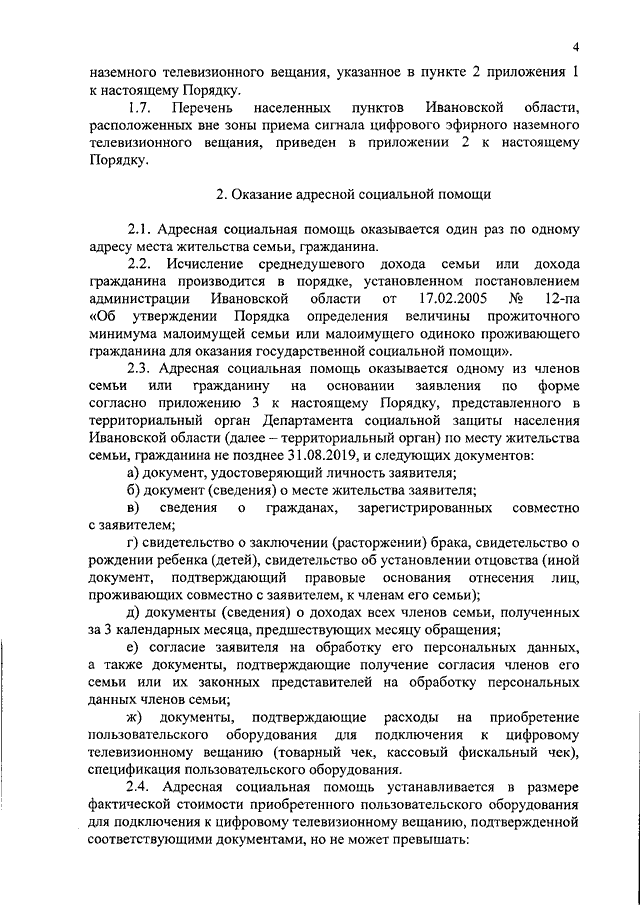Постановление Правительства Ивановской области от 19.03.2019 N 104-п "Об утверждении Порядка оказания адресной социальной помощи малоимущим семьям и малоимущим одиноко проживающим гражданам в целях компенсации затрат на приобретение пользовательского оборудования для подключения к цифровому телевизионному вещанию в 2019 году в Ивановской области"