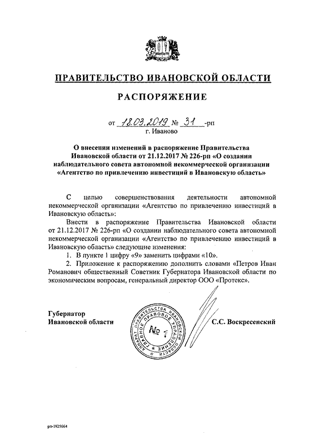 Распоряжение Правительства Ивановской области от 18.03.2019 N 31-рп "О внесении изменений в распоряжение Правительства Ивановской области от 21.12.2017 N 226-рп "О создании наблюдательного совета автономной некоммерческой организации "Агентство по привлечению инвестиций в Ивановскую область"