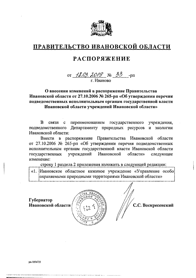 Распоряжение Правительства Ивановской области от 18.03.2019 N 33-рп "О внесении изменений в распоряжение Правительства Ивановской области от 27.10.2006 N 265-рп "Об утверждении перечня подведомственных исполнительным органам государственной власти Ивановской области учреждений Ивановской области"