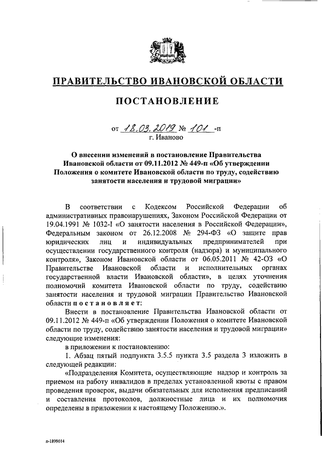 Постановление Правительства Ивановской области от 18.03.2019 N 101-п "О внесении изменений в постановление Правительства Ивановской области от 09.11.2012 N 449-п "Об утверждении Положения о комитете Ивановской области по труду, содействию занятости населения и трудовой миграции"