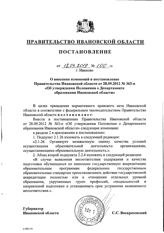 Постановление Правительства Ивановской области от 18.03.2019 N 100-п "О внесении изменений в постановление Правительства Ивановской области от 28.09.2012 N 363-п "Об утверждении Положения о Департаменте образования Ивановской области"