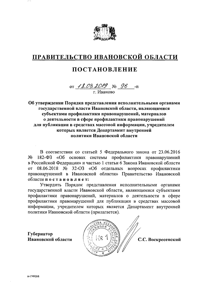 Постановление Правительства Ивановской области от 18.03.2019 N 96-п "Об утверждении Порядка представления исполнительными органами государственной власти Ивановской области, являющимися субъектами профилактики правонарушений, материалов о деятельности в сфере профилактики правонарушений для публикации в средствах массовой информации, учредителем которых является Департамент внутренней политики Ивановской области"
