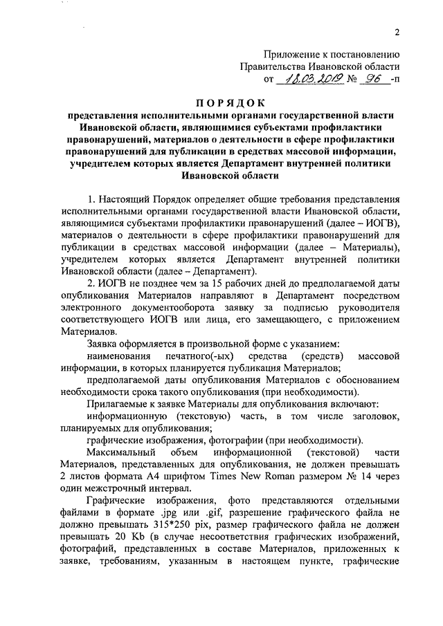 Постановление Правительства Ивановской области от 18.03.2019 N 96-п "Об утверждении Порядка представления исполнительными органами государственной власти Ивановской области, являющимися субъектами профилактики правонарушений, материалов о деятельности в сфере профилактики правонарушений для публикации в средствах массовой информации, учредителем которых является Департамент внутренней политики Ивановской области"