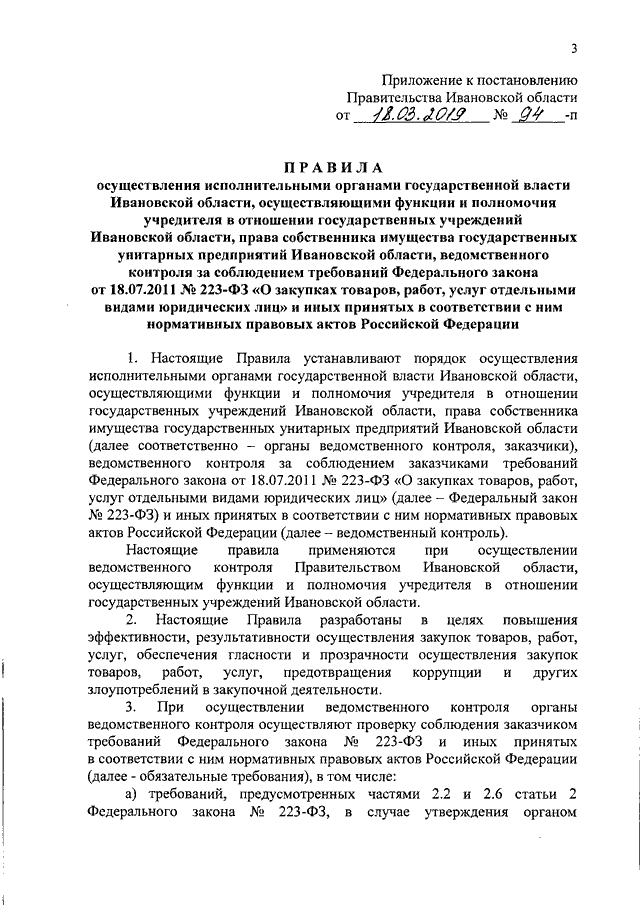 Постановление Правительства Ивановской области от 18.03.2019 N 94-п "Об утверждении Правил осуществления исполнительными органами государственной власти Ивановской области, осуществляющими функции и полномочия учредителя в отношении государственных учреждений Ивановской области, права собственника имущества государственных унитарных предприятий Ивановской области, ведомственного контроля за соблюдением требований Федерального закона от 18.07.2011 N 223-ФЗ "О закупках товаров, работ, услуг отдельными видами юридических лиц" и иных принятых в соответствии с ним нормативных правовых актов Российской Федерации"