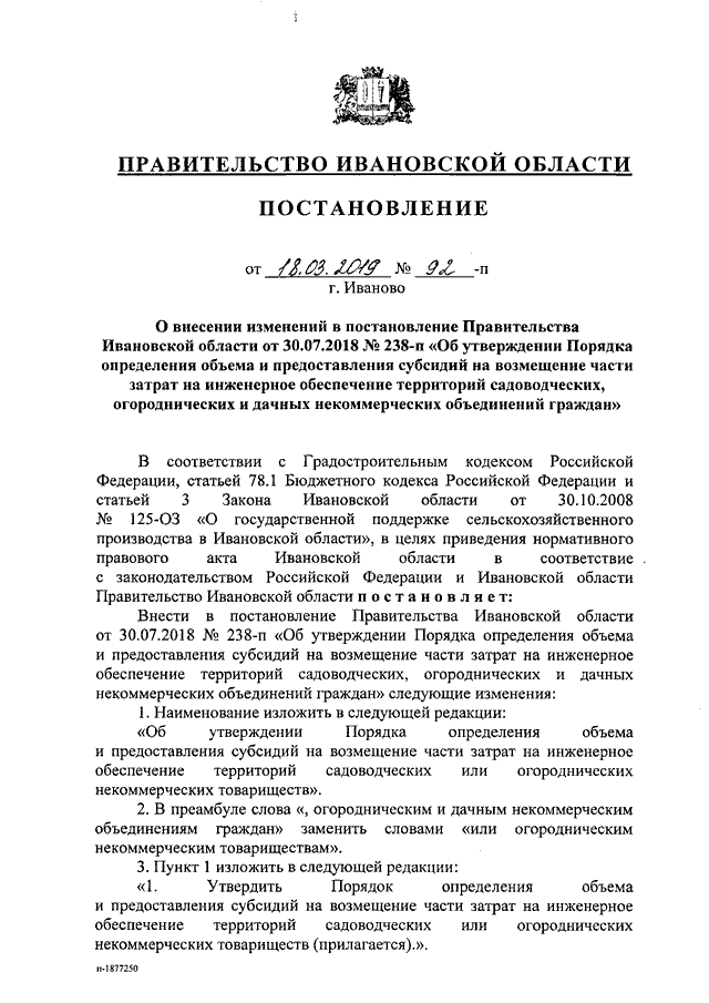 Постановление Правительства Ивановской области от 18.03.2019 N 92-п "О внесении изменений в постановление Правительства Ивановской области от 30.07.2018 N 238-п "Об утверждении порядка определения объема и предоставления субсидий на возмещение части затрат на инженерное обеспечение территорий садоводческих, огороднических и дачных некоммерческих объединений граждан"