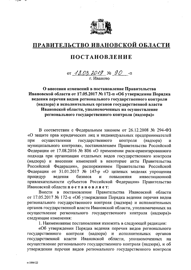Постановление Правительства Ивановской области от 18.03.2019 N 90-п "О внесении изменений в постановление Правительства Ивановской области от 17.05.2017 N 172-п "Об утверждении Порядка ведения перечня видов регионального государственного контроля (надзора) и исполнительных органов государственной власти Ивановской области, уполномоченных на осуществление регионального государственного контроля (надзора)" (вместе с "Перечнем видов регионального государственного контроля (надзора), в отношении которых применяется риск-ориентированный подход")