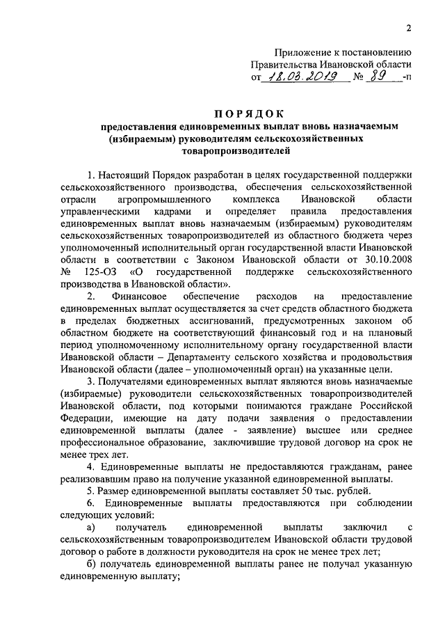 Постановление Правительства Ивановской области от 18.03.2019 N 89-п "Об утверждении Порядка предоставления единовременных выплат вновь назначаемым (избираемым) руководителям сельскохозяйственных товаропроизводителей"