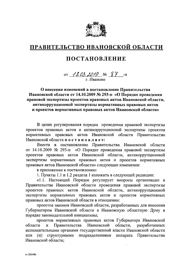 Постановление Правительства Ивановской области от 18.03.2019 N 87-п "О внесении изменений в постановление Правительства Ивановской области от 14.10.2009 N 293-п "О Порядке проведения правовой экспертизы проектов правовых актов Ивановской области, антикоррупционной экспертизы нормативных правовых актов и проектов нормативных правовых актов Ивановской области"