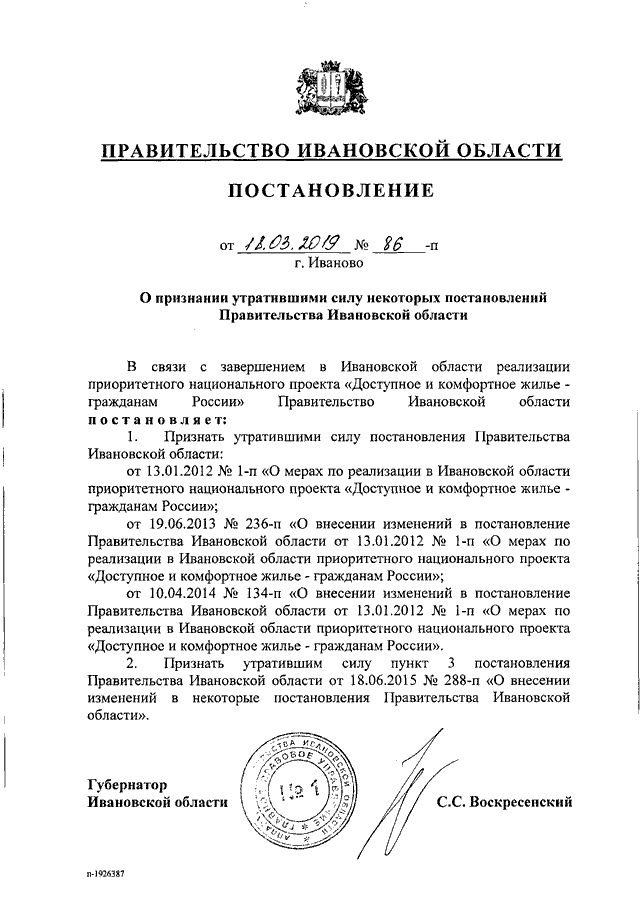 Постановление Правительства Ивановской области от 18.03.2019 N 86-п "О признании утратившими силу некоторых постановлений Правительства Ивановской области"