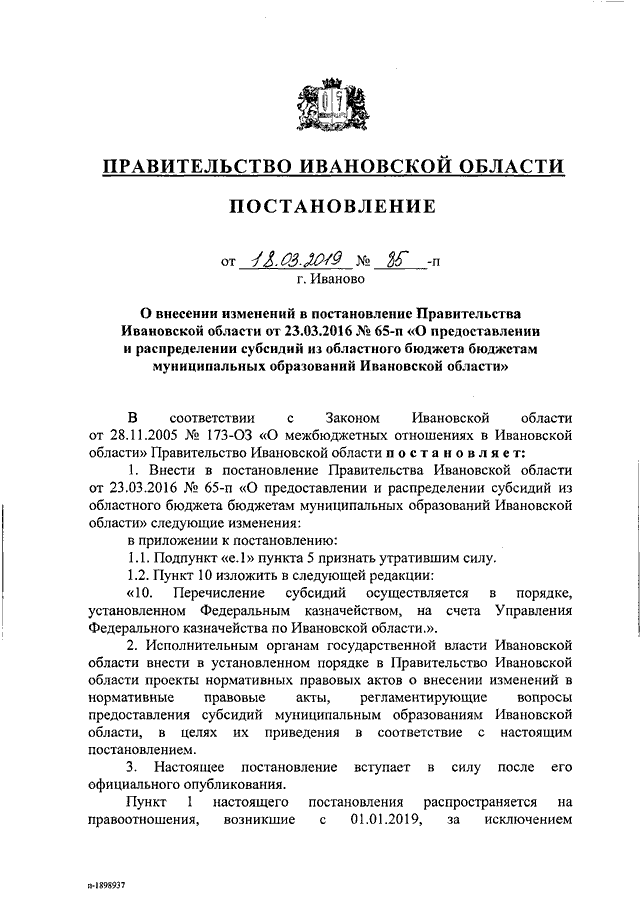 Постановление Правительства Ивановской области от 18.03.2019 N 85-п "О внесении изменений в постановление Правительства Ивановской области от 23.03.2016 N 65-п "О предоставлении и распределении субсидий из областного бюджета бюджетам муниципальных образований Ивановской области"
