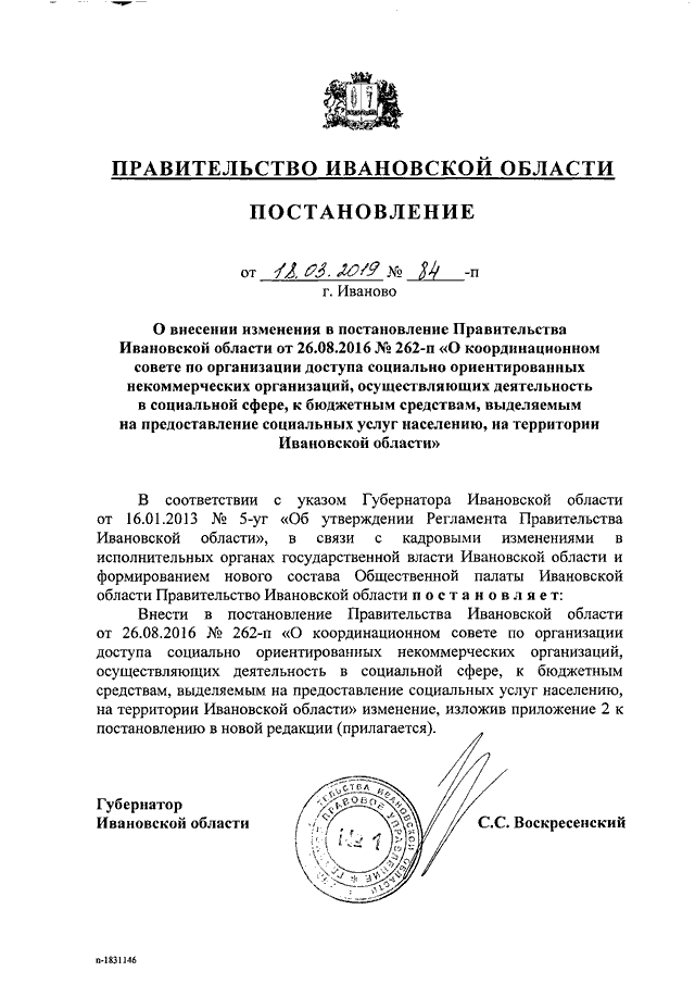 Постановление Правительства Ивановской области от 18.03.2019 N 84-п "О внесении изменения в постановление Правительства Ивановской области от 26.08.2016 N 262-п "О координационном совете по организации доступа социально ориентированных некоммерческих организаций, осуществляющих деятельность в социальной сфере, к бюджетным средствам, выделяемым на предоставление социальных услуг населению, на территории Ивановской области"
