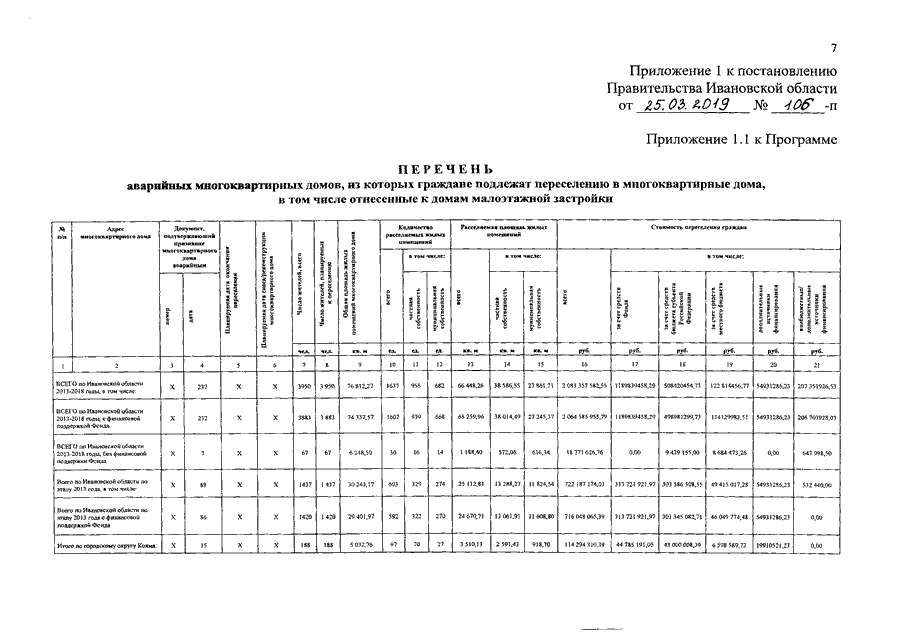 Постановление Правительства Ивановской области от 25.03.2019 N 106-п "О внесении изменений в постановление Правительства Ивановской области от 15.04.2013 N 134-п "Об утверждении региональной адресной программы "Переселение граждан из аварийного жилищного фонда на территории Ивановской области на 2013 - 2018 годы" (вместе с "Перечнем аварийных многоквартирных домов, из которых граждане подлежат переселению в многоквартирные дома, в том числе отнесенные к домам малоэтажной застройки", "Реестром аварийных многоквартирных домов по способам переселения, из которых граждане подлежат переселению в многоквартирные дома, в том числе отнесенные к домам малоэтажной застройки")