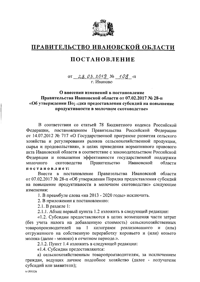 Постановление Правительства Ивановской области от 28.03.2019 N 108-п "О внесении изменений в постановление Правительства Ивановской области от 07.02.2017 N 28-п "Об утверждении Порядка предоставления субсидий на повышение продуктивности в молочном скотоводстве"